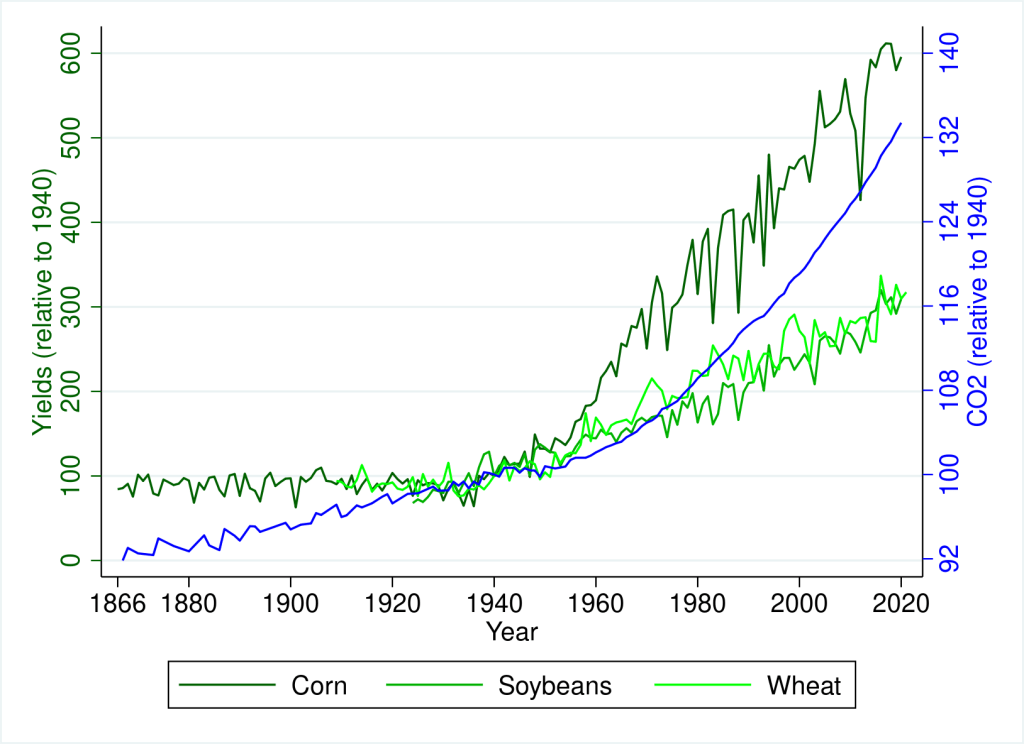 We present a novel methodology to estimate the CO2 fertilization effect on crop yields using data from NASA’s Orbiting Carbon Observatory satellites. Our study complements field and chamber experiments by examining county-level crop yields under actual growing conditions across the majority of US cropland. For identification, we utilize remotely sensed, year-to-year CO2 anomalies from county-specific trends and further instrument for these anomalies using wind patterns. We find a CO2 fertilization effect greater than that reported in most field and chamber experiments. In a thought exercise, we apply the CO2 fertilization effect estimated in our sample from 2015–2022 backward to 1940. Assuming no other limiting factors, we find that rising CO2 was a major driver of past yield growth, particularly for wheat—with important implications for estimates of future climate change damages.